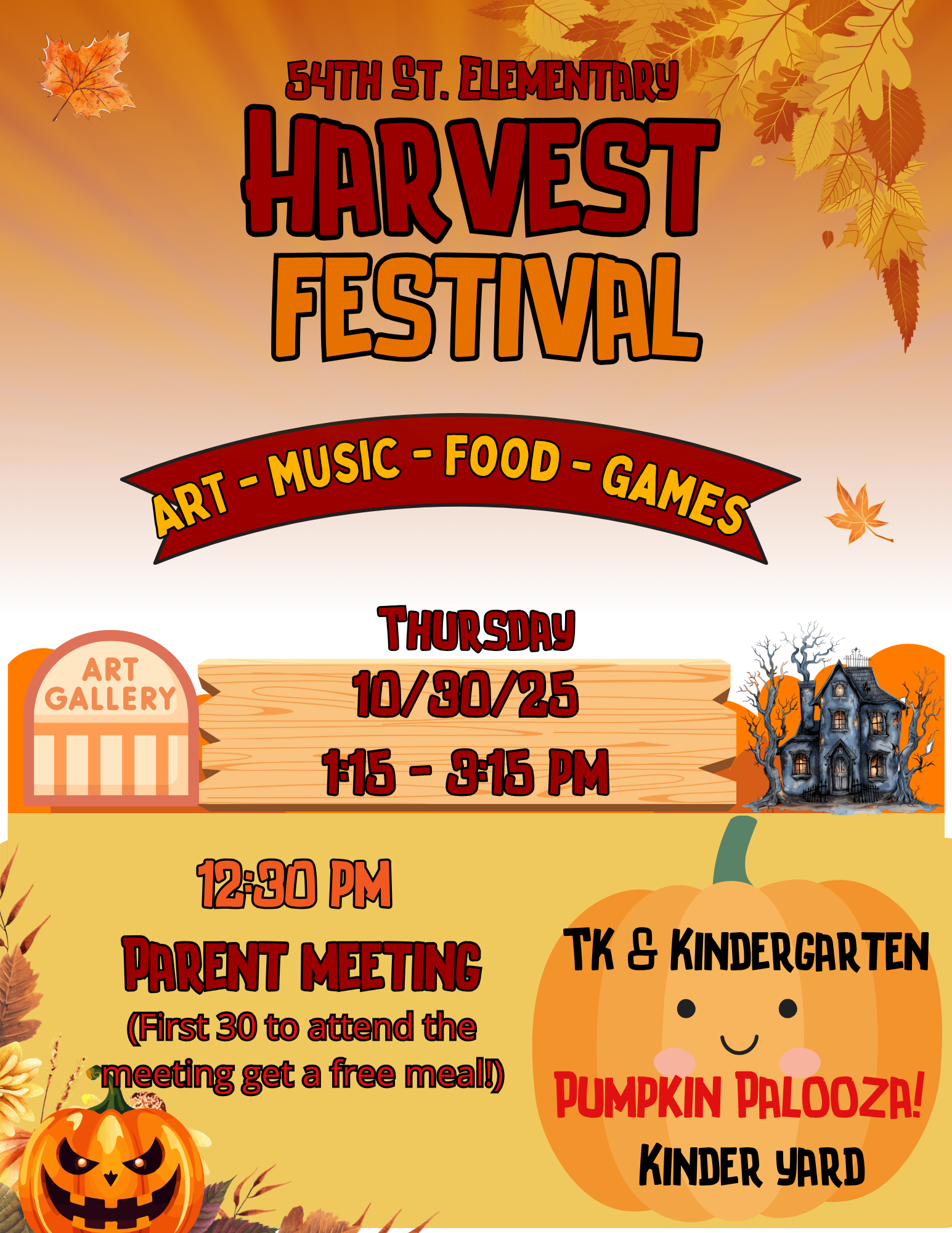 There will be an important parent/guardian meeting before the festivities. The first 30 parents/guardians will receive a free meal from the Harvest Festival.